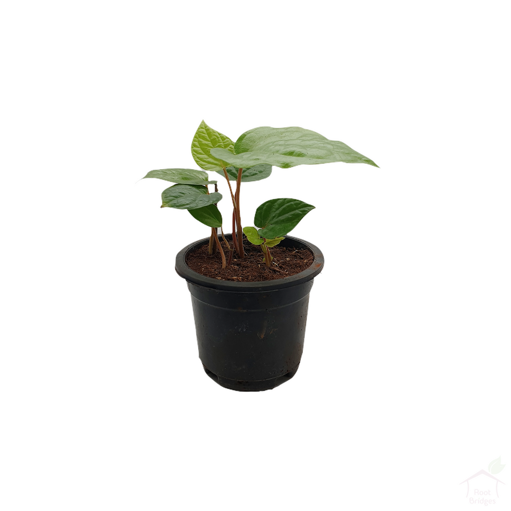 The Betel Leaf, or Magai Paan is a creeper with glossy heart-shaped leaves that are popularly consumed in India. It is fairly easy to grow even for new plant parents with a little care. Let it climb or trail and it will be a great addition to both your collection and food habit as it is known to cool the body and provide many nutrients.